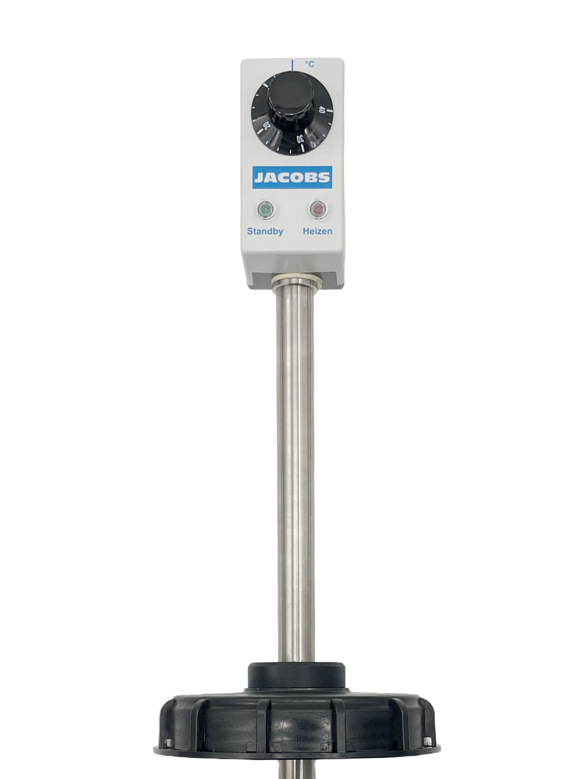 Ein im unteren Ende des Führungsrohres eingebauter Temperatursensor reagiert auf die Temperatur der umgebenden Flüssigkeit und schaltet die Heizung ein bzw. aus. Kontrollleuchten zeigen an, ob geheizt wird oder ob die Temperatur erreicht ist. Dadurch hält die IBC-Heizung die gewünschte Temperatur relativ konstant (Differenz zwischen Ein- und Ausschaltpunkt ca. 3°C).