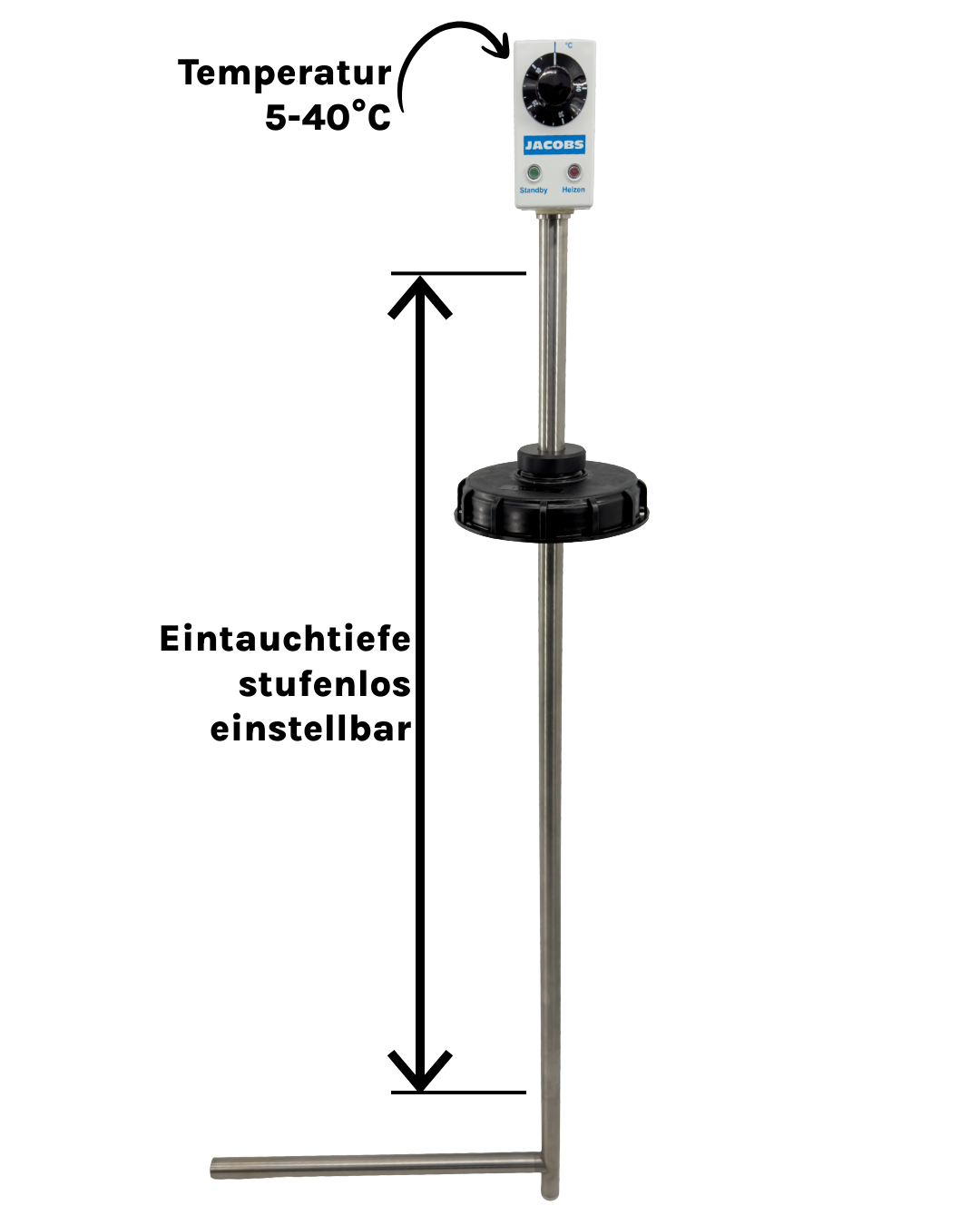 Die Heizung wird einfach durch die Öffnung des IBC-Tanks eingeführt und steht auf dem unteren Ende. Ein Halter im Schraubdeckel ermöglicht eine anpassbare Höheneinstellung des Führungsrohres, somit ist die Eintauchtiefe variabel. Das Heizrohr geht im rechten Winkel vom Führungsrohr ab und hat in keiner Höheneinstellung Bodenkontakt. Die Länge des Heizrohres ist so bemessen, dass es in der Regel nicht mit dem Auslauf in Berührung kommt, selbst wenn es darauf ausgerichtet ist.